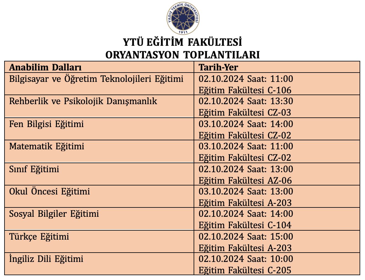 YTÜ Oryantasyon Günleri kapsamında, Eğitim Fakültesi Anabilim Dalları, Tanışma ve Bilgilendirme Toplantılarına YTÜ ailesine yeni katılan tüm öğrencilerimizi bekliyoruz.