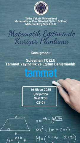 Tammat Yayıncılık ve Eğitim Danışmanlık Ltd. Şti. kurucusu, eğitimci, yazar ve matematik öğretmeni Süleyman Tozlu matematik eğitiminde kariyer süreçlerine yönelik seminer verecektir. Seminer 16 Nisan 2025 Çarşamba günü, 09:30 saatinde gerçekleşecektir.